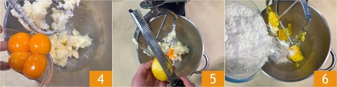 Then add the egg yolks 4 and lemon zest 5. Turn on the mixer to combine. Finally, add the flour 6.