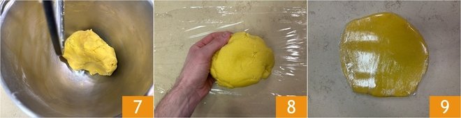 Knead until you get a compact and homogeneous mixture 7. Form a flat dough disc 8, wrap it in cling film 9 and let it rest in the refrigerator for at least 3 hours.