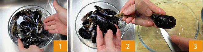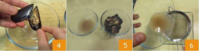 making sure that when you open it, the mussel remains intact and attached to the shell 4. Repeat the process with all of the mussels and keep their water 5, filtering it through a strainer 6, as this will be used later on to wet the breadcrumbs.