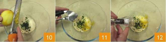 the zest of the lemon 10, a crushed garlic clove 11 and a sprinkling of black pepper 12.