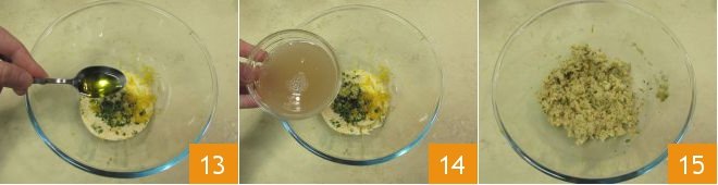 Now pour in 2½ tbsp (30 g) of olive oil 13 and ? cup (150 g) of filtered mussel water 14. Stir to achieve a smooth, moist mixture 15.
