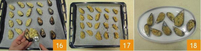 Using a spoon, stuff the mussels 16, drizzle them with olive oil 17, and bake them on the top shelf of a conventional oven preheated to 390°F (200°C) for 12 minutes and then on maximum power in broil mode for another 3 minutes. Once cooked, take your mussels au gratin out of the oven and serve immediately 18.