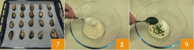 As you open the mussels, place them on a baking tray lined with parchment paper 7. Next, prepare the breadcrumbs. Pour them into a bowl, together with the grated Grana Padano cheese 8, the chopped fresh parsley 9,