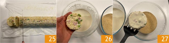 After the firming time, retrieve the roll and cut it into 15 disks, each about 1.2 inches thick 25. If necessary, you can shape them with your hands to restore the circular shape. Then dip the fritters in the batter 26, drain and coat them in breadcrumbs 27.