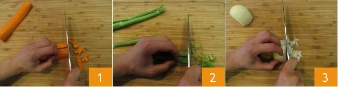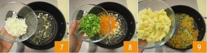 Then add the chopped onion 7, carrots, and celery 8. After a few minutes, add the potatoes 9