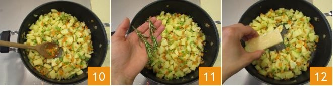 and allow the flavor to develop for a few minutes, stirring occasionally to keep everything from burning 10. Add the rosemary 11 and the cheese rind (you can wash it first and scrape off the outer part) 12,