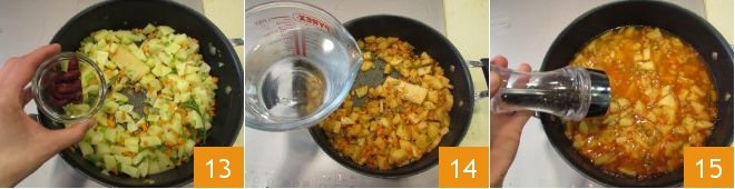 then add the tomato paste 13 and stir. Pour in 2? cups (600 g) of hot water 14 and season with pepper 15.