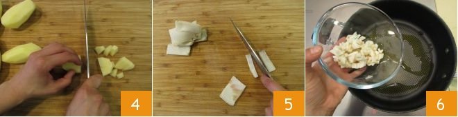 Next, peel the potatoes and roughly chop them into small pieces of around an inch (2 cm) 4. Finally, slice and then chop the lard 5. At this point you’ll have everything you need. Now turn your attention to the stove. Pour a glug of oil into a pan, add the lard and warm over low heat for a few minutes 6.