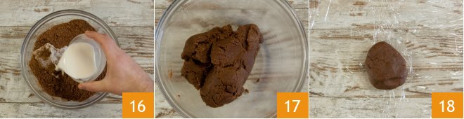 then add a portion of the milk 16 and continue to mix. Pour the milk little by little to better adjust the consistency; you will need 3/8-1/2 cup. Mix the mixture well until it is compact and homogeneous 17. Then transfer it onto a layer of plastic wrap 18.