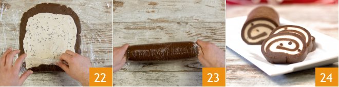 Using the plastic wrap to lift the edge 22, roll up the dough firmly but gently. You will get your roll 23, store it in the freezer for 2 hours before cutting it. Once cut into slices, wait a few minutes before serving it 24.
