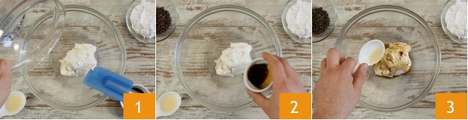 To prepare the no-bake sweet roll, prepare the coffee in the required amount using a moka pot. Let it cool. Meanwhile, make the cream by pouring the well-drained ricotta into a bowl 1, then add the cooled coffee 2 and the rum 3.