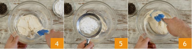 Mix with a spatula 4, then sift in the powdered sugar 5 and mix again 6.