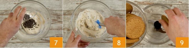 Add the chocolate chips 7, mix one last time 8 and place in the refrigerator until the base is ready. Then prepare the base. Melt the butter and let it cool. Pour the dry biscuits into a mixer 9