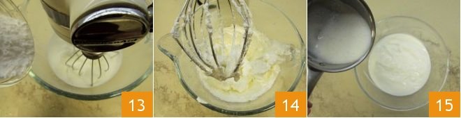 Pour the fresh liquid cream into the bowl of the stand mixer with a whip, add the powdered sugar 13 and whip until frothy 14. If you don't have a stand mixer, you can also use a handheld mixer to whip the cream. Pour the yogurt into a bowl, then add the milk in which you have melted the gelatin, which will have cooled in the meantime 15.