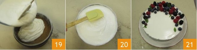 Pour the cream obtained into the mold 19 with the base that will have hardened in the meantime, level the surface with a spatula 20 and put back in the fridge to harden for at least 5 hours. Once the no-bake yogurt cake is ready, garnish it with berries as desired and serve 21.