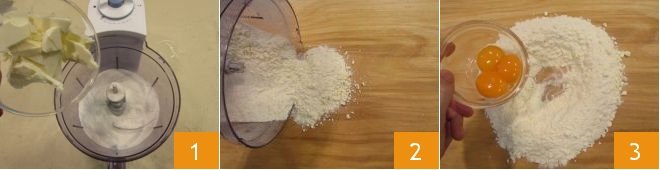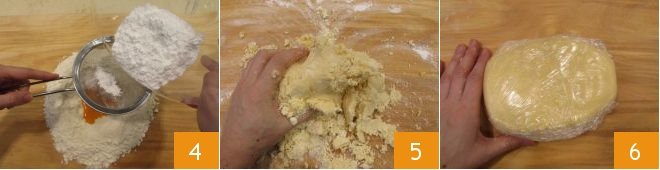 sift the powdered sugar around the well 4. Start to knead briefly, mixing the eggs in the center and gradually collecting the flour; try to knead briefly just enough time to get a dough that is sufficiently compact 5 which you can wrap in cling film 6. Let the dough rest in the refrigerator for at least 30 minutes.
