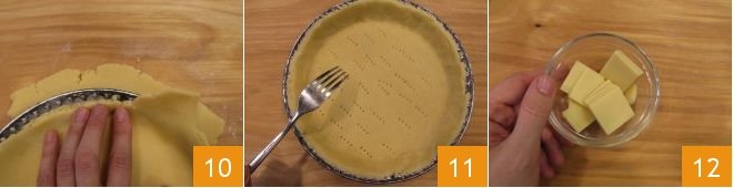 Trim the edges 10 and gather the excess dough, with which you will prepare the diamond shapes. Finally prick the base 11 and set aside the pan. Proceed with the cream: so place the cocoa butter in a bowl 12