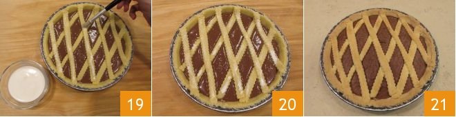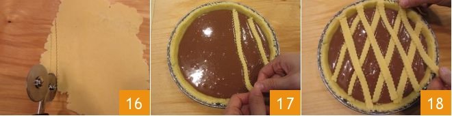 Take the dough again and roll it out again, on the floured surface, and form diamond shapes about 2/5 inch wide, with a serrated wheel 16. Place them on the cake pan first in one direction 17 and then in the other 18, in order to cross them and create a diamond pattern.