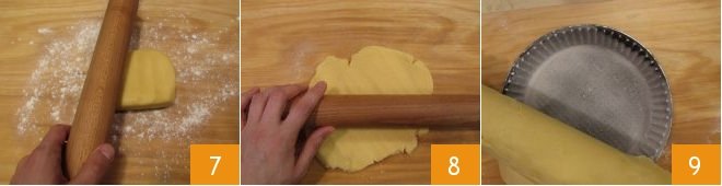 Then take the dough and beat it on a lightly floured pastry board 7 in this way you will soften it a bit, making the rolling out easier. Roll the dough to a thickness of about 1/5 inch 8. Then wrap the dough around the rolling pin and place it in a 8 and 2/3 inches cake pan already buttered and floured 9.