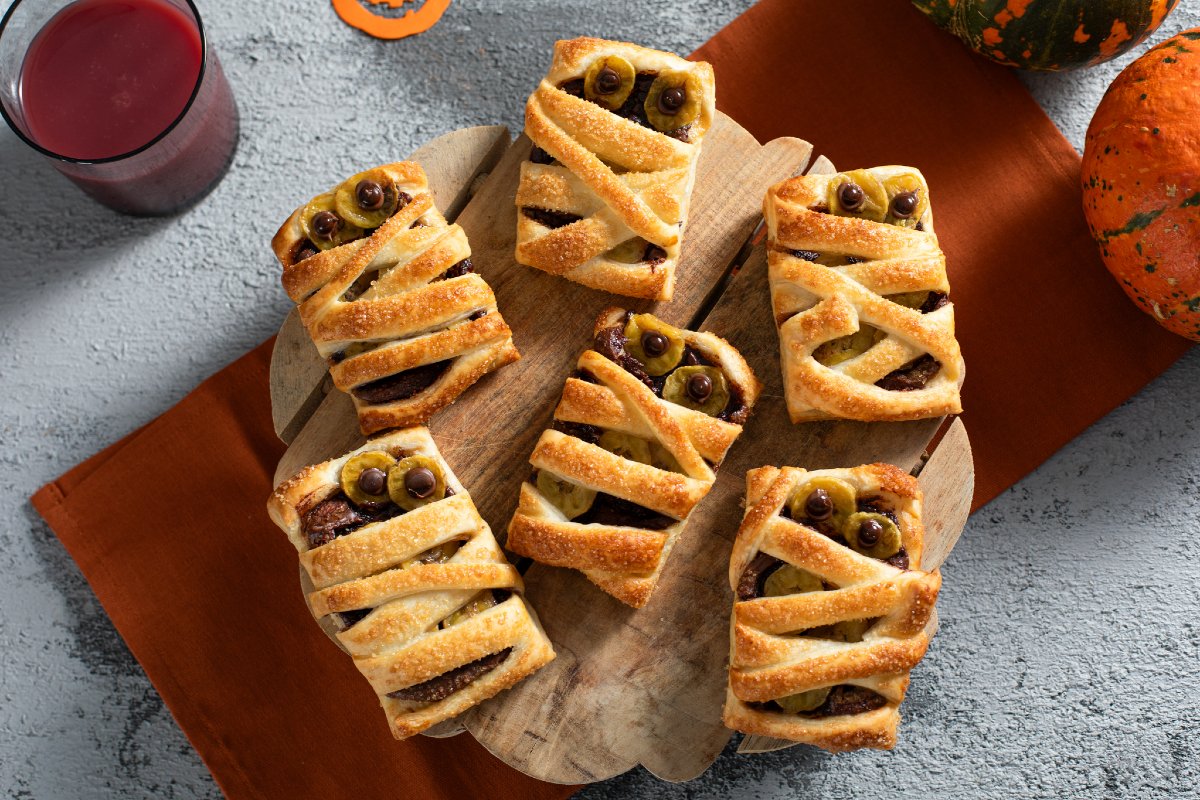 Along with costumes and carved pumpkins, Halloween treats make this holiday unforgettable. Our Nutella and banana mummies are a quick and easy idea, perfect for snacking on during the spookiest night of the year. They're great to make with kids and adults alike. These sweet mummies, made with ready-to-use puff pastry, Nutella, and bananas, are super delicious... With the strips of puff pastry and the banana "eyes", you can creatively craft these adorable mummies. They're perfect for a Halloween buffet alongside these puff pastry pumpkins, our witch's finger treats, or our brain cheesecake. Or, serve them for a Halloween breakfast to share with the whole family.