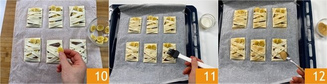 Brush the edges with a bit of milk 7 and layer more strips on top to form mummies 8. Trim the edges if the strips extend too far out 9.