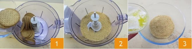 To prepare the Nutella cheesecake, start with the base. Melt the butter in a small saucepan over very low heat, then leave to cool. Meanwhile, pour the dry graham crackers into a food processor 1, then blitz to get a powder 2 and transfer to a bowl. Add the melted butter and leave to cool slightly 3.