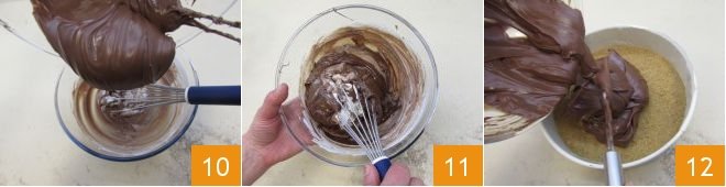 At this point, add the rest of the Nutella 10 and continue to blend with the whisk 11 until you get a smooth cream. Take the cake pan from the refrigerator and pour the cheese and Nutella mixture over the now hardened crust 12.