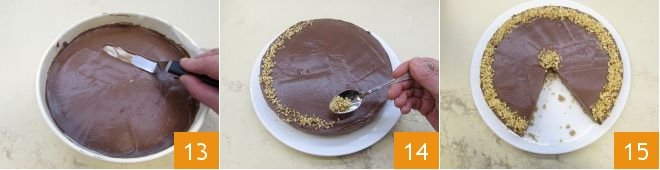 Level the surface well with a spatula 13, cover with plastic wrap, and leave to firm up in the refrigerator for at least 6 hours (preferably overnight). Once this time has passed, transfer the cheesecake to a serving plate and decorate as you please with the chopped hazelnuts 14. Serve your Nutella cheesecake nicely chilled 15!
