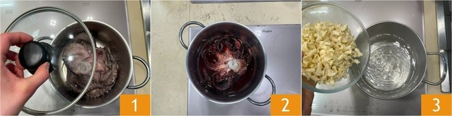 To prepare the cold pasta with octopus, first place the octopus in a pot for "dry" cooking: the octopus will cook in its own water. Cover with a lid 1 and let it cook over medium-low heat for 20-30 minutes 2, then let it cool in the pot. Meanwhile, cook the pasta 3 and as soon as it's ready, drain it, transfer it to a bowl, season with a drizzle of oil, and let it cool.