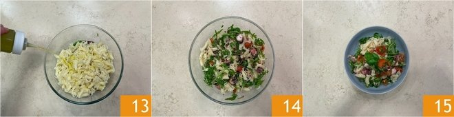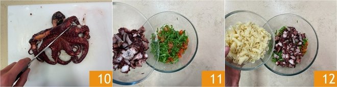 As soon as the octopus is cool, cut it into pieces 10, if you prefer you can remove some skin by rubbing it with paper towels. Add the octopus to the bowl with the arugula and tomatoes 11, then add the now cold pasta 12.