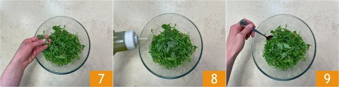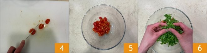 Wash the cherry tomatoes and cut them into quarters, or in half if they are small 4. Transfer them to a large bowl 5 and add the arugula, tearing it with your hands 6.
