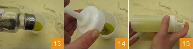 season with salt and pepper 13, close the spout 14, then shake the bottle to mix 15.