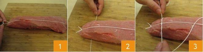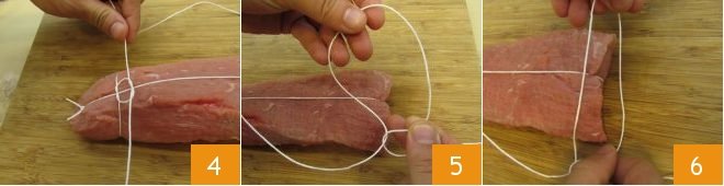 before knotting it 4. Take the longer part of the twine and make a loop 5, then widen it with your hands and slide the meat inside it 6.