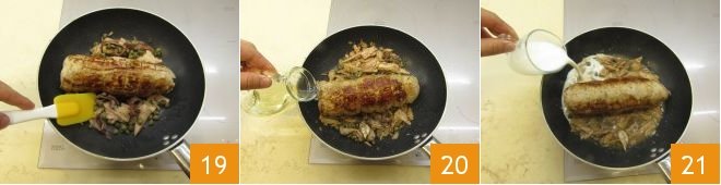 Break the tuna fillets slightly 19 and when they are toasted and well browned, deglaze with the white wine 20. Once the white wine has slightly reduced, bathe with the milk without pouring directly on the meat 21.