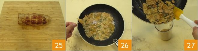 In the meantime, prepare the hard-boiled eggs, cooking them for about 9 minutes from boiling. Once cooled, peel them and set them aside. As soon as the meat has cooled, transfer it to a cutting board 25 and remove the garlic from the cooking base 26; then pour the base into a mixer container 27