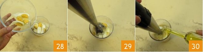 and add the sliced hard-boiled eggs 28. Start blending with an immersion blender 29 and add more: 1/2 tablespoon of oil 30,