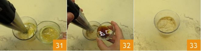 the vegetable broth 31 and the marsala wine 32. Blend everything until you obtain a smooth cream 33, adding more broth if it is too thick. Transfer to the refrigerator to cool it down a bit.