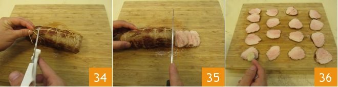 Deal with the meat by removing the twine 34 and slicing it thinly using a very sharp knife 35. Arrange all the meat slices on a cutting board and fill them with a teaspoon of cream, placing it in the center 36.