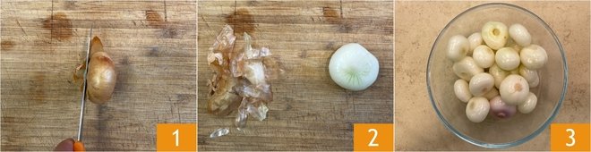 To make onions in oil, first sanitize the jars and lids following the guidelines provided by the Department of Health and Human Services. Proceed with the preparation of the onions: peel them 1 and remove the first layer 2, then collect them in a bowl 3.
