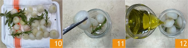 Drain the onions and herbs on a clean cloth and let cool 10. When dry, place the onions in the jar, alternating with the herbs, ensuring all empty spaces are filled 11. Finally, pour olive oil into the jar until all the onions are covered, leaving a space of about 3/4 inch from the top 12.