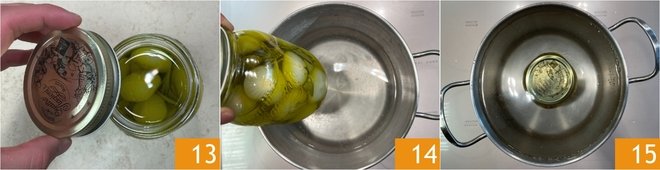 Close the jar with the lid, without tightening it too much so that air can escape and create a vacuum 13. Immerse the jar in a pot full of water 14 and bring to a boil. Boil for 30 minutes from the boiling point, then turn off the heat and let cool in the water 15. Once cooled, check if a vacuum has been created by pressing the center of the lid. You will then have to monitor the jars, because if the oil level drops, you will need to reopen the jars, refill and boil again. Your onions in oil are ready to be stored!