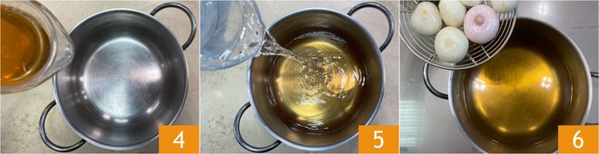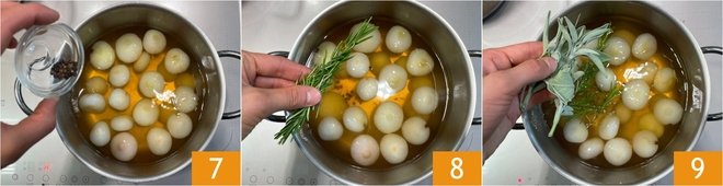 Pour the vinegar 4 and water into a large pot 5 and bring to a boil, then add the onions 6 and boil for 12 minutes.