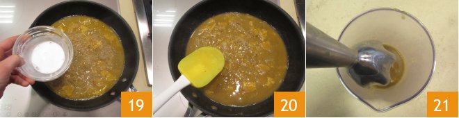 Add this mixture to the gravy 19 and reduce as required 20. Blend the gravy using an immersion blender 21 and keep warm in a small saucepan.