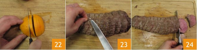 Slice an orange 22, then remove the string from around the meat 23 and carve it 24.