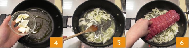 Pour the butter and a drizzle of oil 4 into a fairly large pan. Add the onion and brown over very low heat 5. Increase the flame and place the roast on top 6.
