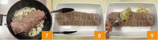 Brown the meat over high heat on both sides 7. Transfer the meat 8 and onions 9 to a baking dish.