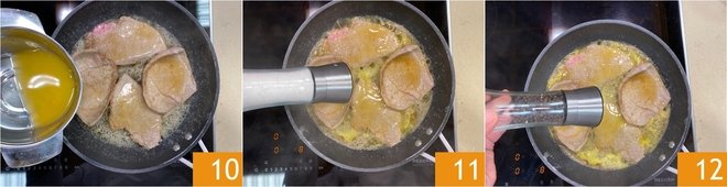 Brown the slices on the other side for 1-2 minutes, then pour in the orange juice 10. Season with salt 11 and pepper 12.