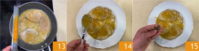 Add most of the grated orange zest 13; mix well to dissolve the cooking juices and turn the slices a couple of times to flavor them. Continue cooking over low heat for a few minutes, until the sauce thickens and becomes creamy; it will take about 8 minutes in total. At this point, all that's left is to plate your orange scaloppine: transfer them to a serving dish, add the sauce 14, and a few thyme leaves 15.