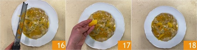 Finish with some of the reserved orange zest 16, the orange segments 17, and serve your orange scaloppine hot 18!
