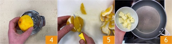 Squeeze one of the oranges 4: you should obtain about 3 oz of juice. Peel the remaining orange and separate the segments with a small knife 5. Place the butter in a large pan 6 and let it melt over low heat.